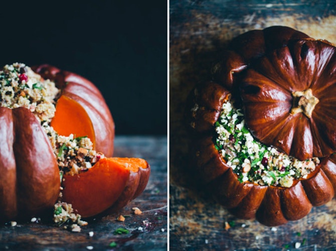 Take advantage of the end of pumpkin season with this beautiful presentation from Green Kitchen Stories. The stuffing itself includes quinoa, kale, and cranberries, and is actually even pretty healthy.