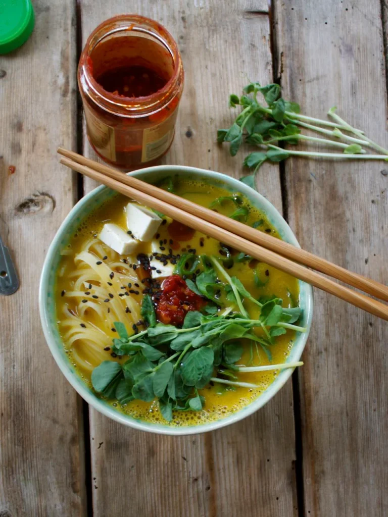 2. Butternut Squash Ramen Bowl With Rice Noodles, Tofu and Pea Shoots