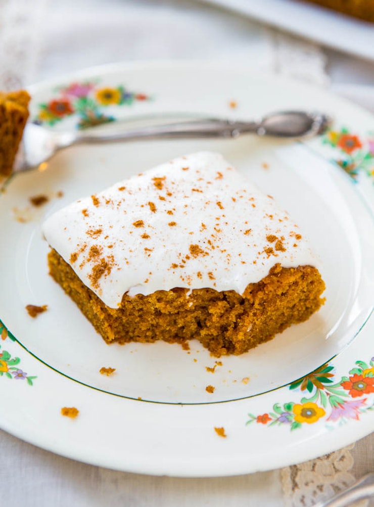 If this isn’t calling your memory back to the “Eat Me” cake from Alice in Wonderland, then I don’t know what will. This pumpkin cake is so soft and moist you would never think it was made without eggs and milk. Spiced with cinnamon, nutmeg, pumpkin spice, cloves, vanilla, and molasses, this vegan dessert combines all the flavors of the holidays and more into one fantastic treat. Find the recipe ataveriecooks.com.