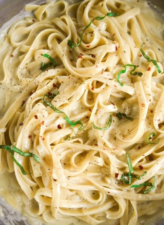 This one-pot creamy garlic pasta is probably the closest recipe I’ll share to a vegan fettuccine alfredo*. Also, sorry in advance for a couple more pictures than usual today. (Now with a recipe video!)